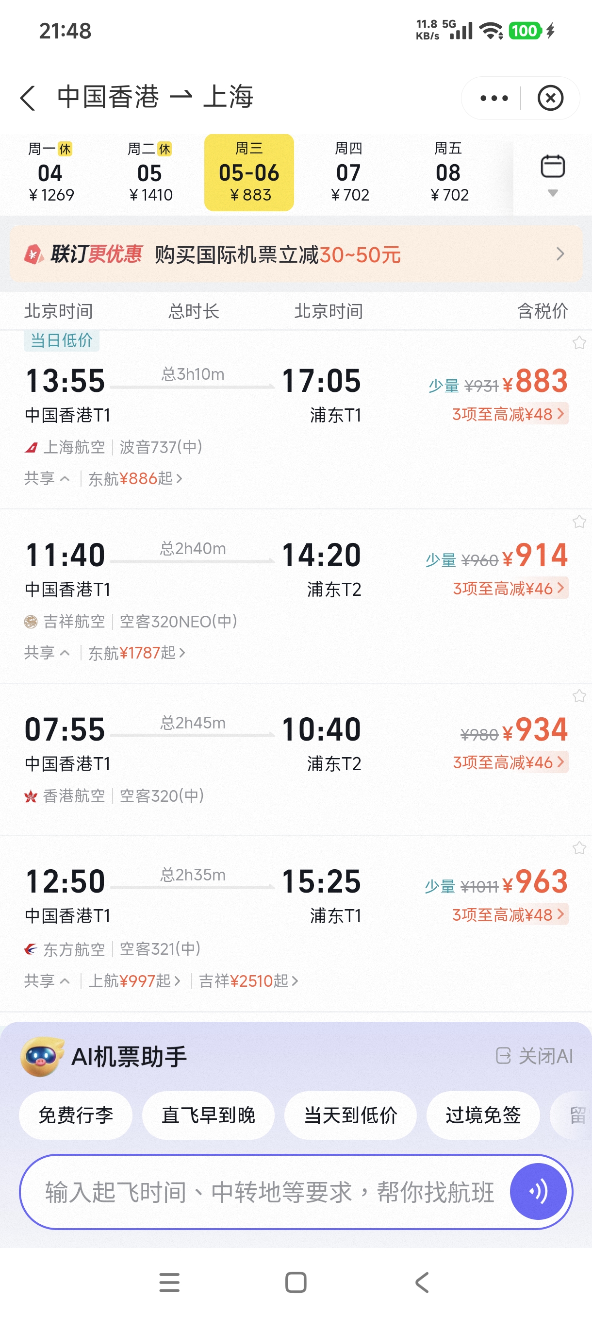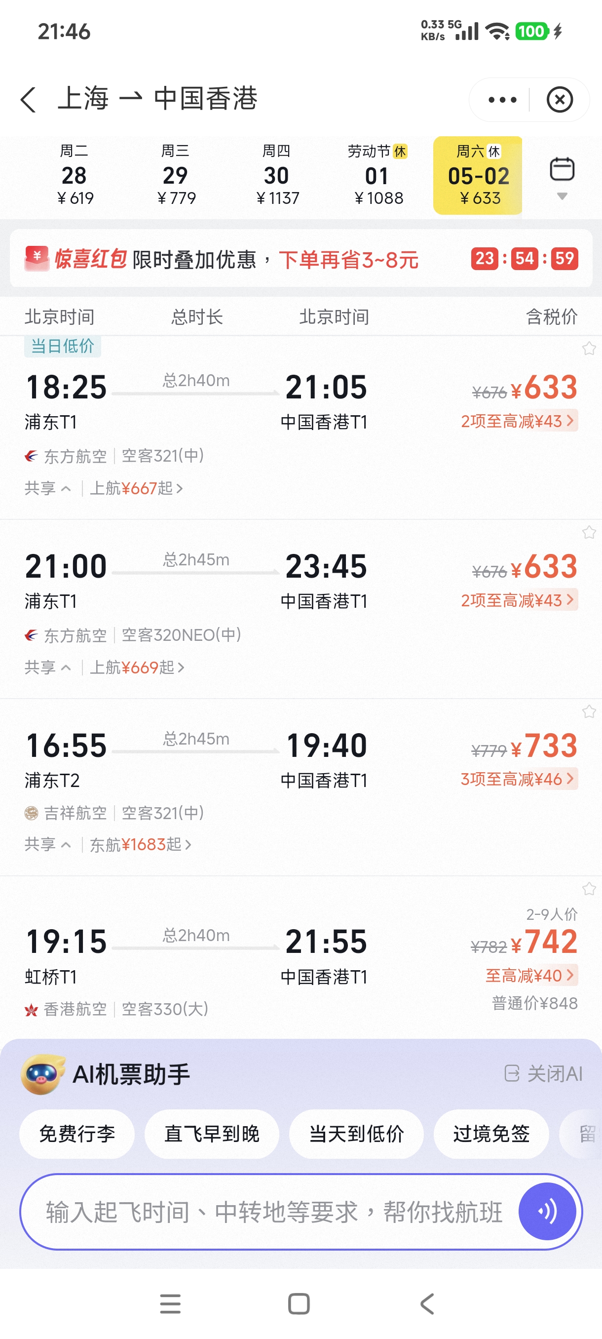 遠離大灣區的人最好不要坐高鐵去香港了,高鐵乘坐時間過長體驗不佳,而且和飛機價格所差不多,坐飛機只需要三個小時.建議提前一到兩個月訂好往返機票,這時候價格最划算,如果臨近節假日不僅價格昂貴,甚至可能沒有餘票了.推薦使用阿里旗下的飛豬,最節省是轉機一次去香港.筆者去香港時,去程是先通過身份證乘坐東方航空班機飛往寧波,再從寧波通過港澳通行證乘坐香港快運的廉價航班飛往香港,返程則是乘坐東方航空航班從香港直飛上海.