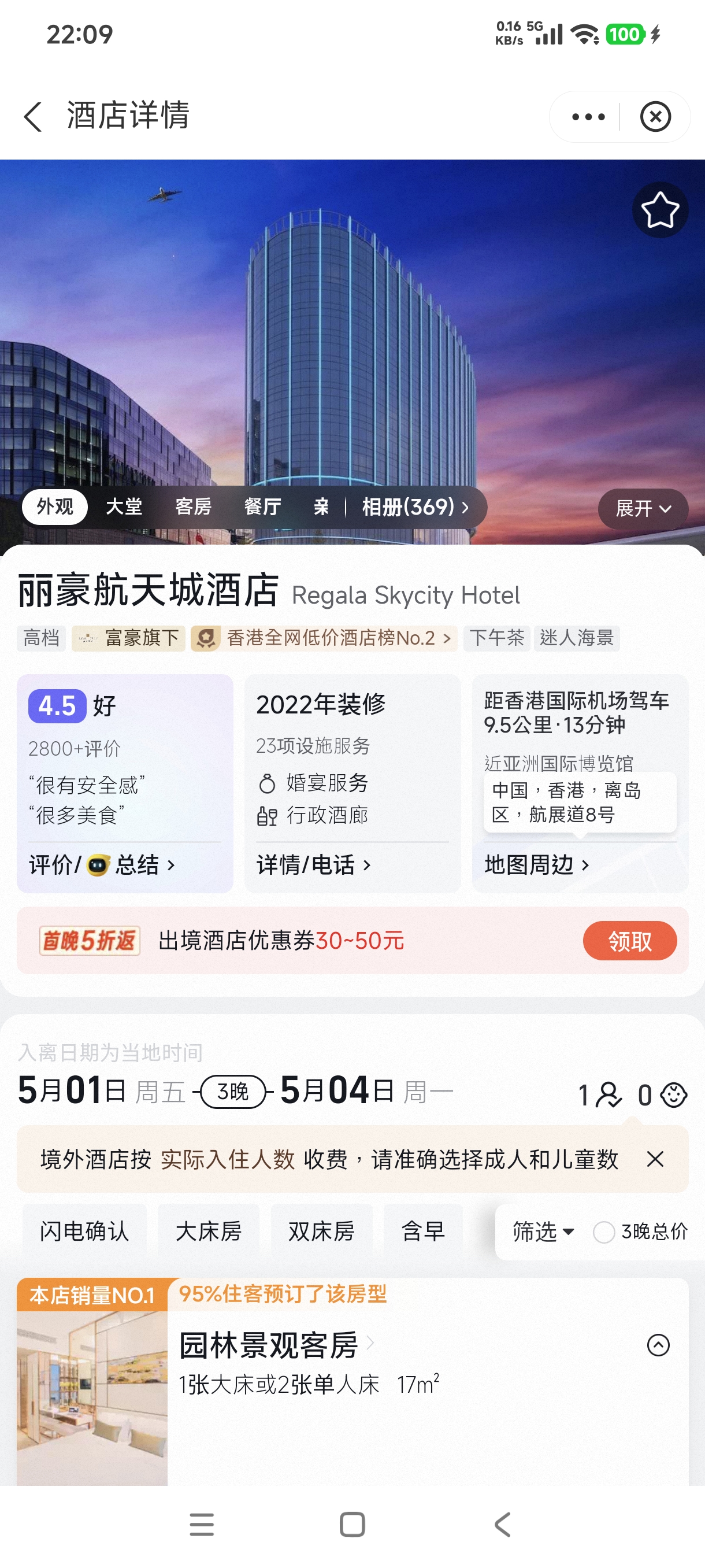 推薦在飛豬上使用港澳通行證預訂香港航天城麗豪酒店單人房,屆時到達香港機場後,根據指示牌到大巴站點有免費大巴直達酒店.